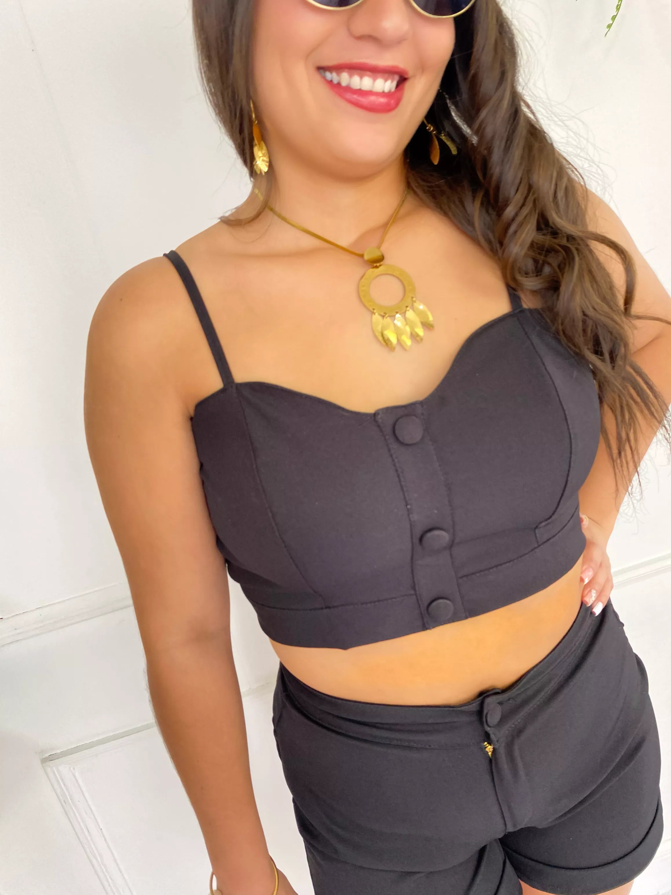 El top cuenta con botones frontales decorativos y tirantes ajustables que permiten un calce perfecto. El short tiene pretina enresortada en la parte posterior, brindando un ajuste cómodo que se adapta a la figura.