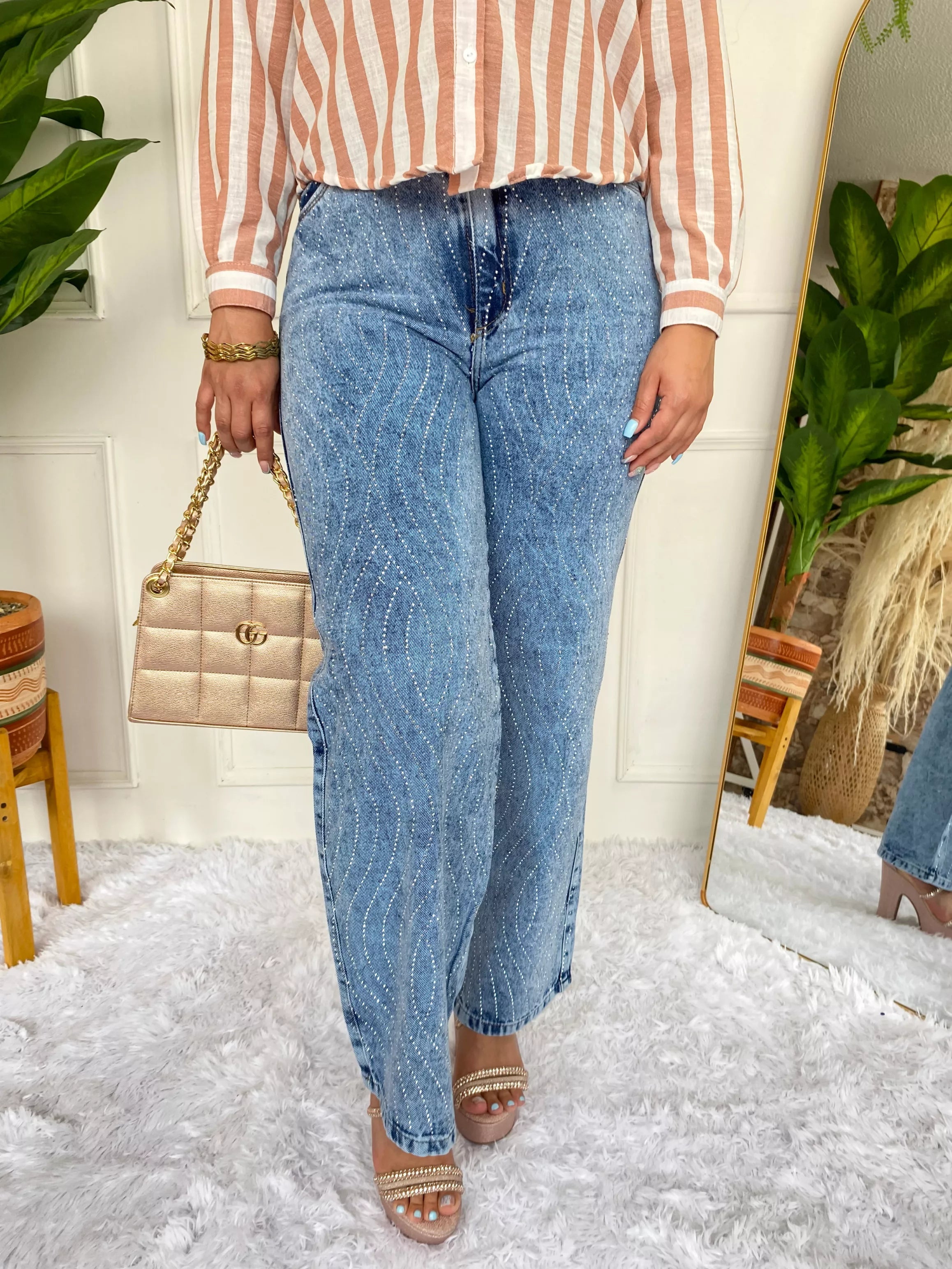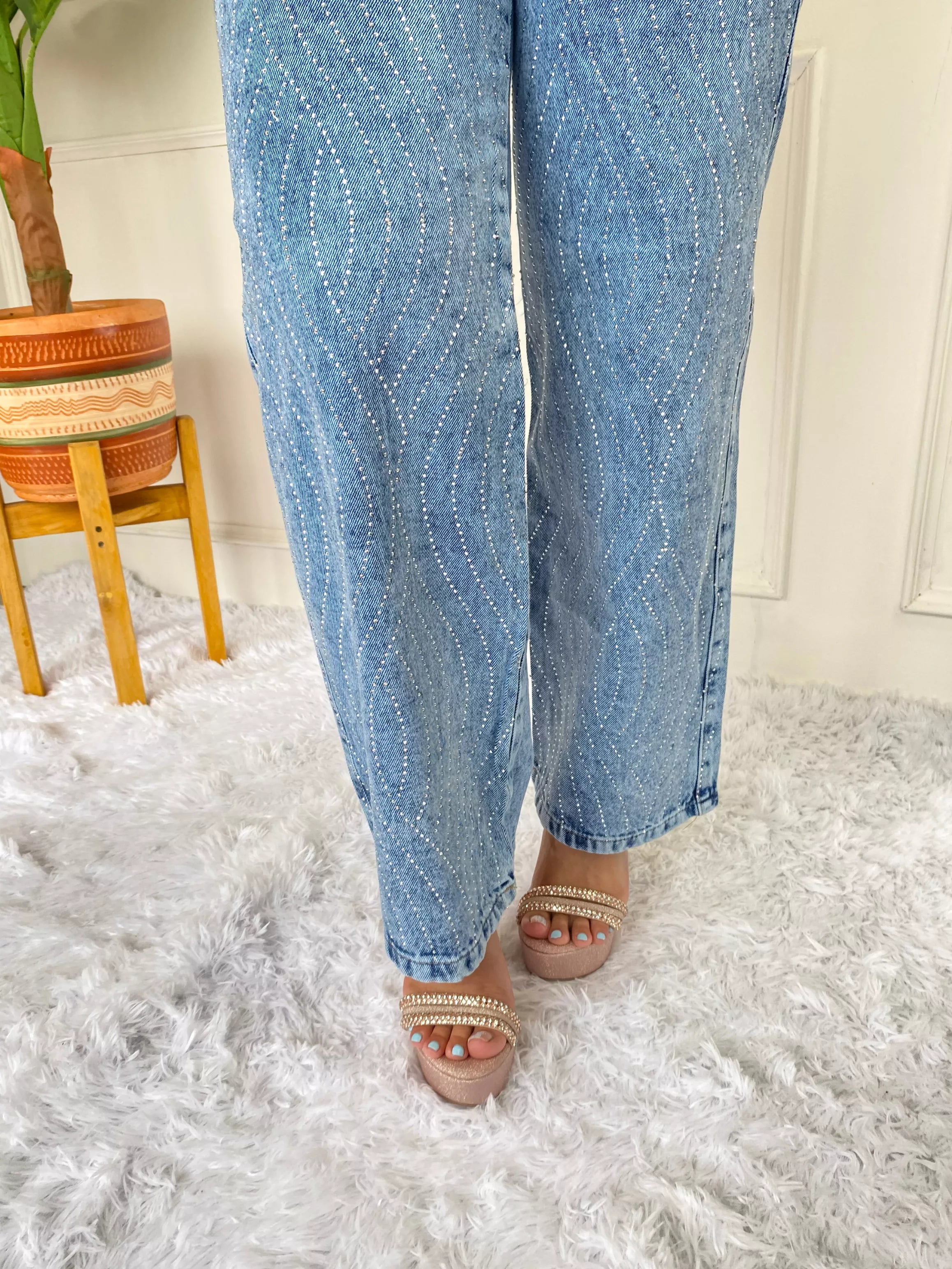 Jean de tiro alto con corte palazo y detalles de piedras en forma de olas que realzan su estilo único. Tela rígida que moldea y estiliza la figura, ideal para un look moderno y elegante. 💙