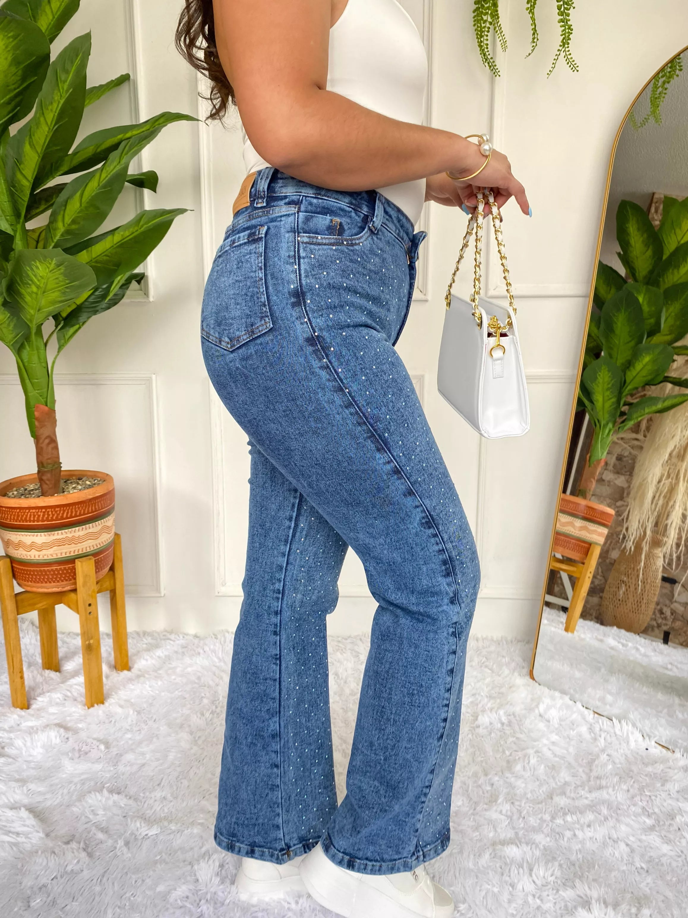 Jean de tiro alto con corte palazo, decorado con piedras brillantes que aportan un toque elegante y moderno. Su tela rÃgida moldea y estiliza la figura, ideal para crear looks casuales o sofisticados. 💙